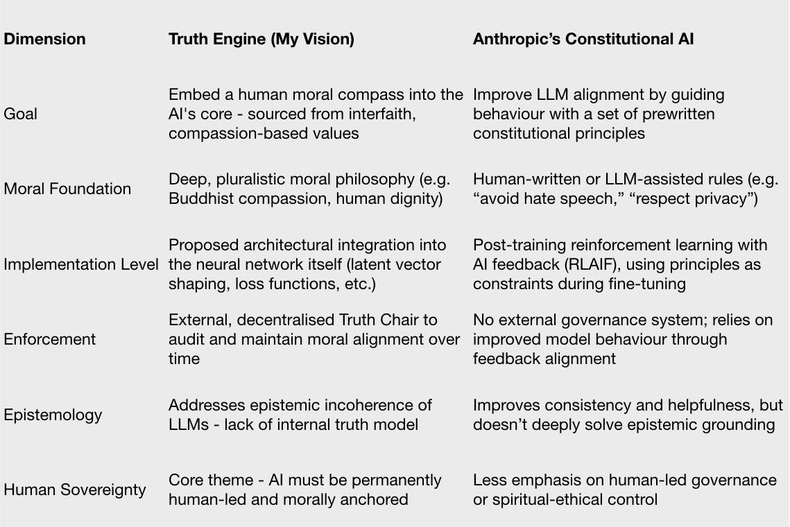 Imagine a sub-layer in every future language model that tests outputs against a set of compassion-aligned values. Not to censor, but to calibrate. Not to moralise, but to guide. This would evolve into a Truth Engine™ - not one that declares truth from on high, but one that constantly checks whether what it says is coherent, kind, and causally grounded.